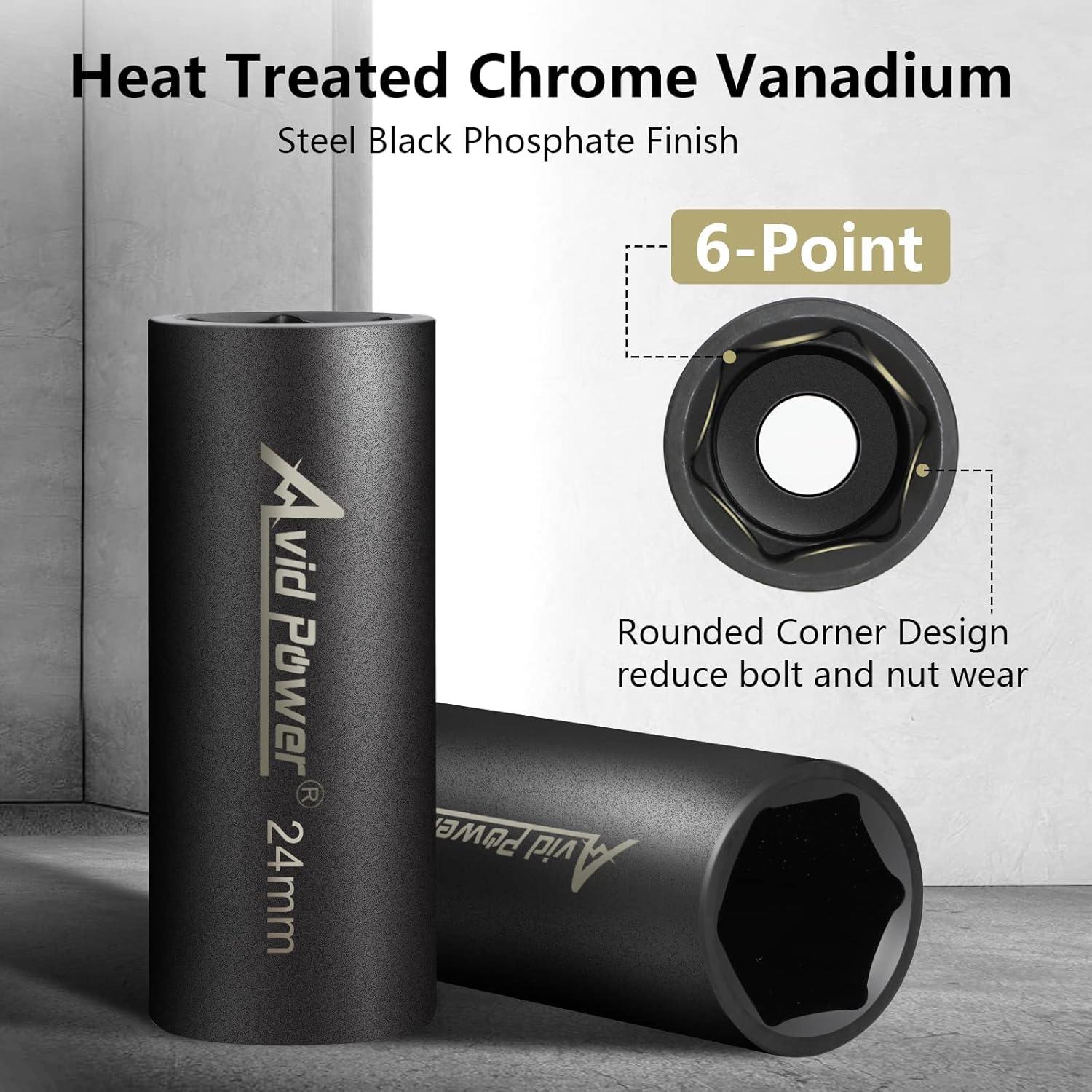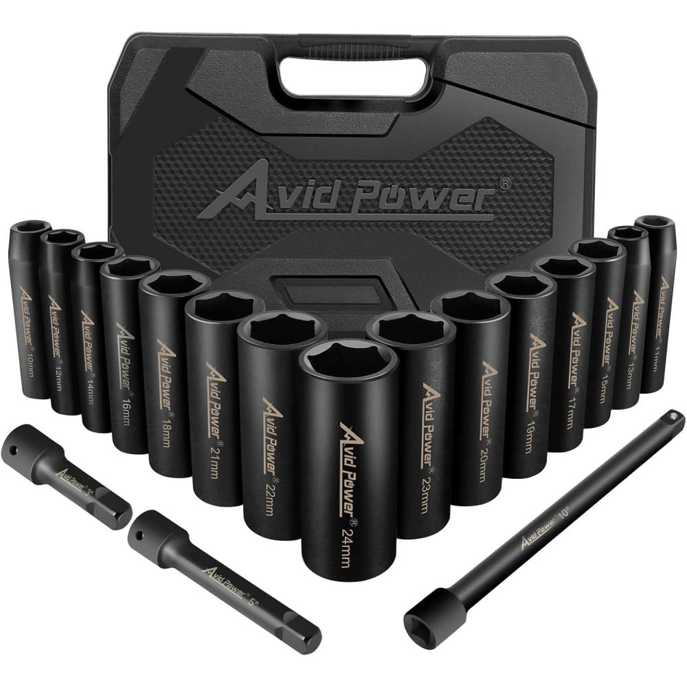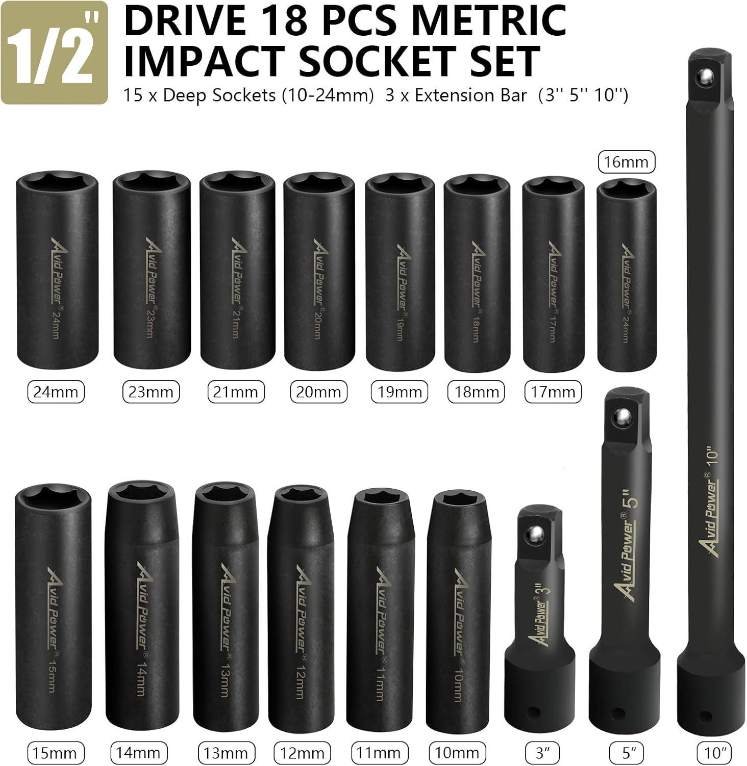 18-PIECE METRIC IMPACT SOCKET SET – Includes 15 deep sockets (10mm-24mm) and 3 extension bars (3″, 5″, 10″), ideal for automotive repairs, DIY projects, and emergency fixes