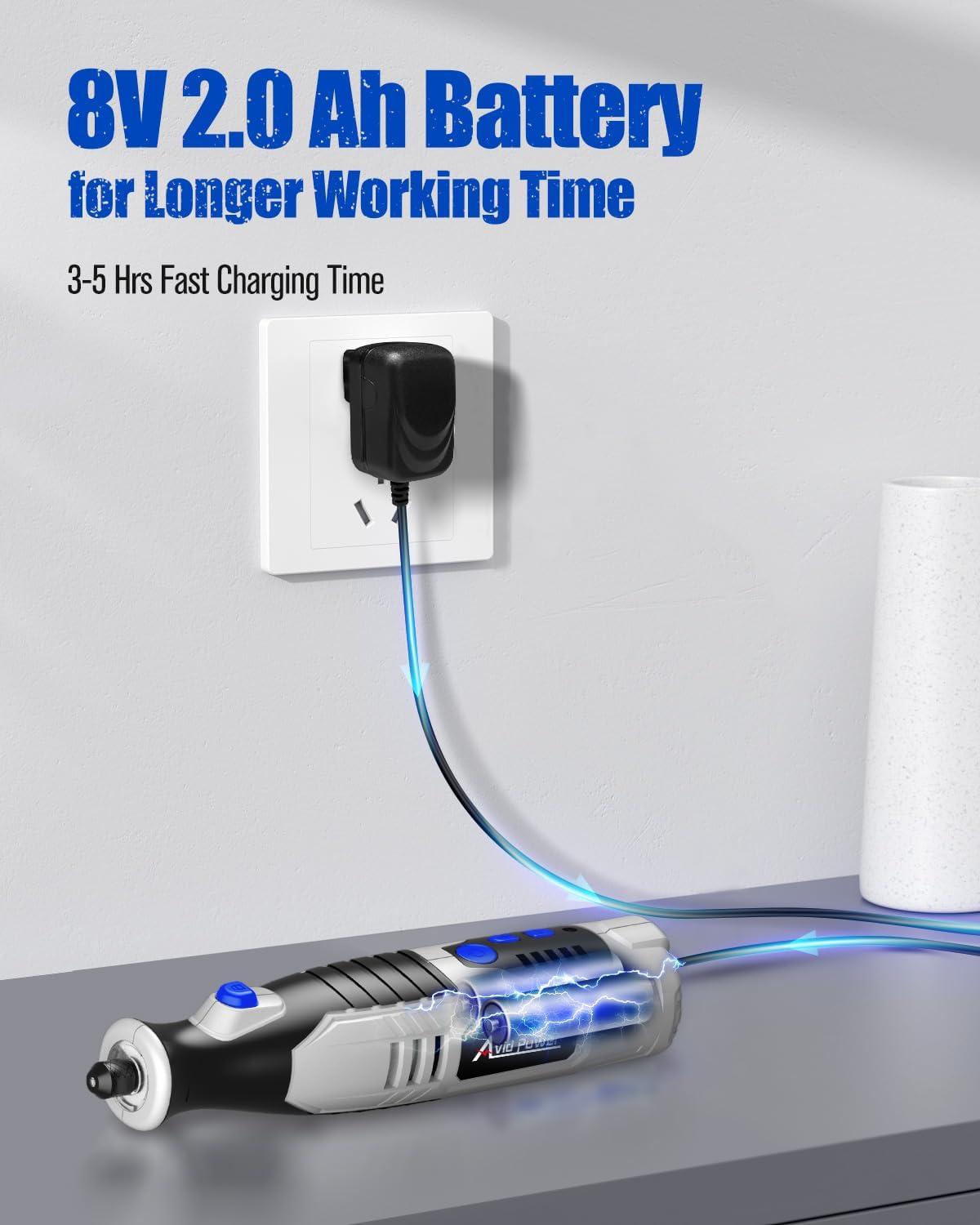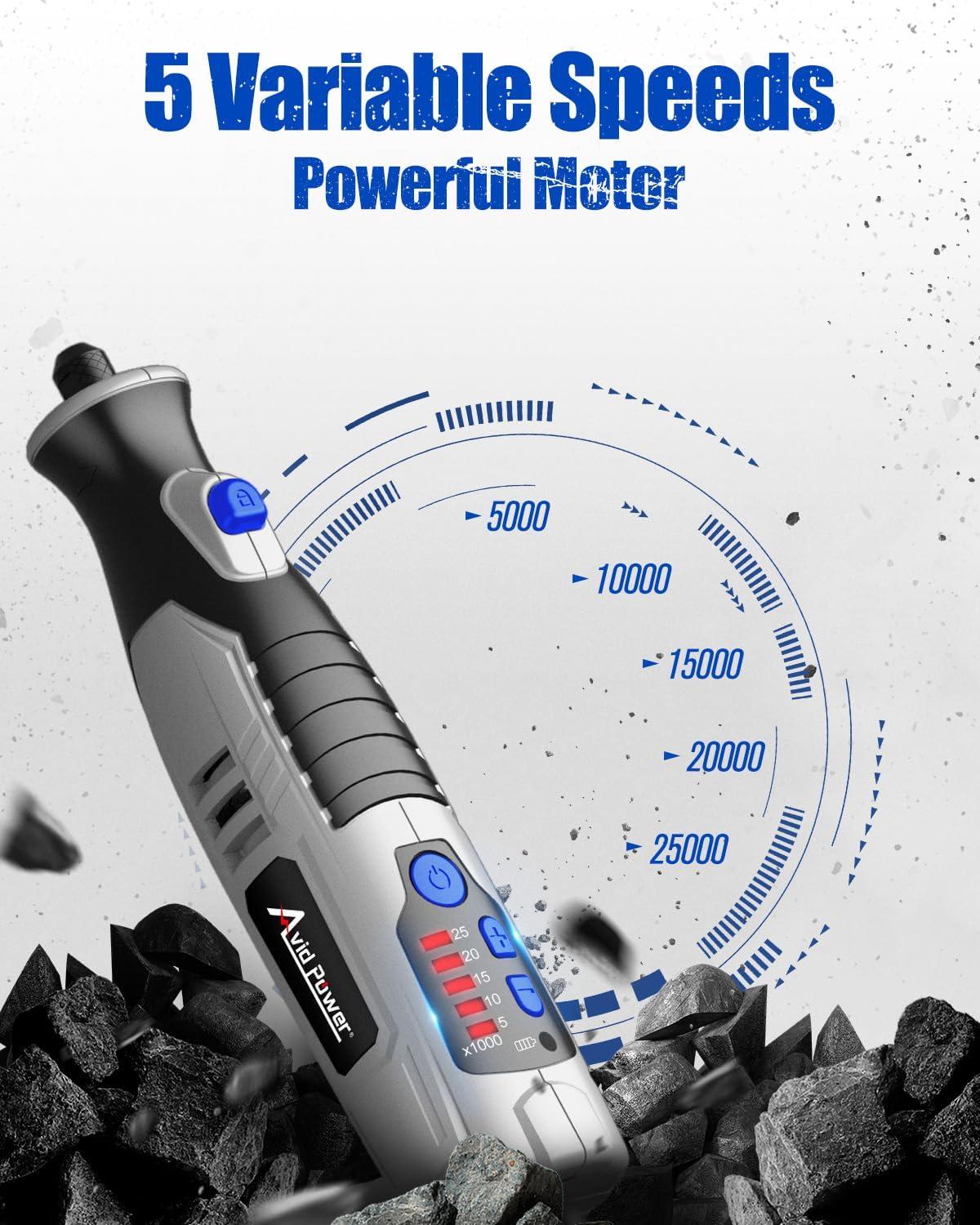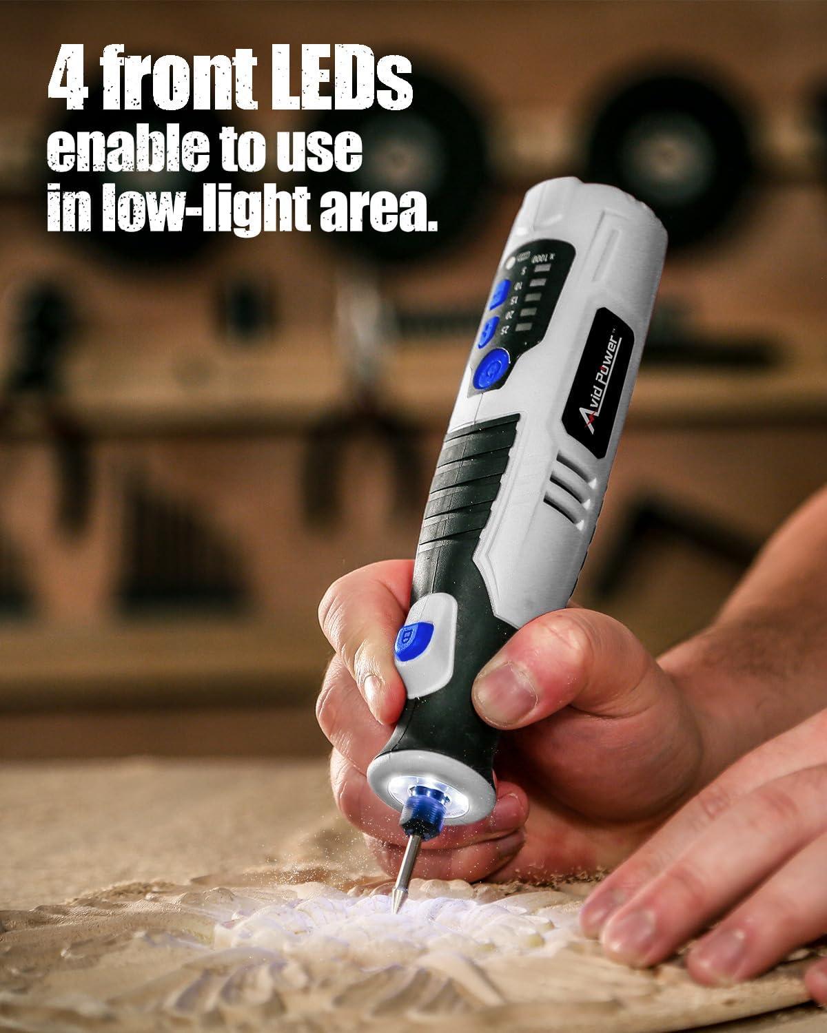 AVID POWER Cordless Rotary Tool 2.0 Ah 8V Rechargeable Rotary Tool, 4 Front LED Lights, 5 Speeds, 60 Pcs Rotary Accessories with Bag for Carving, Engraving, Sandng, Polishing and Cutting - Grey(Grey)