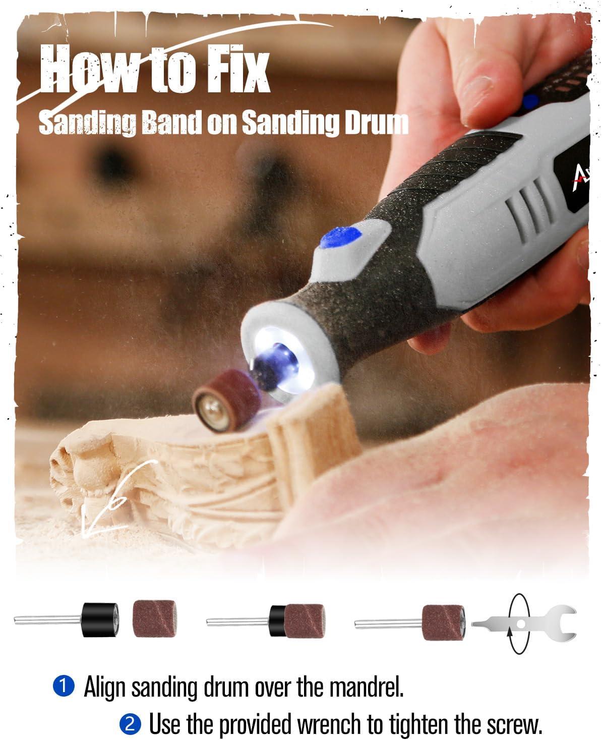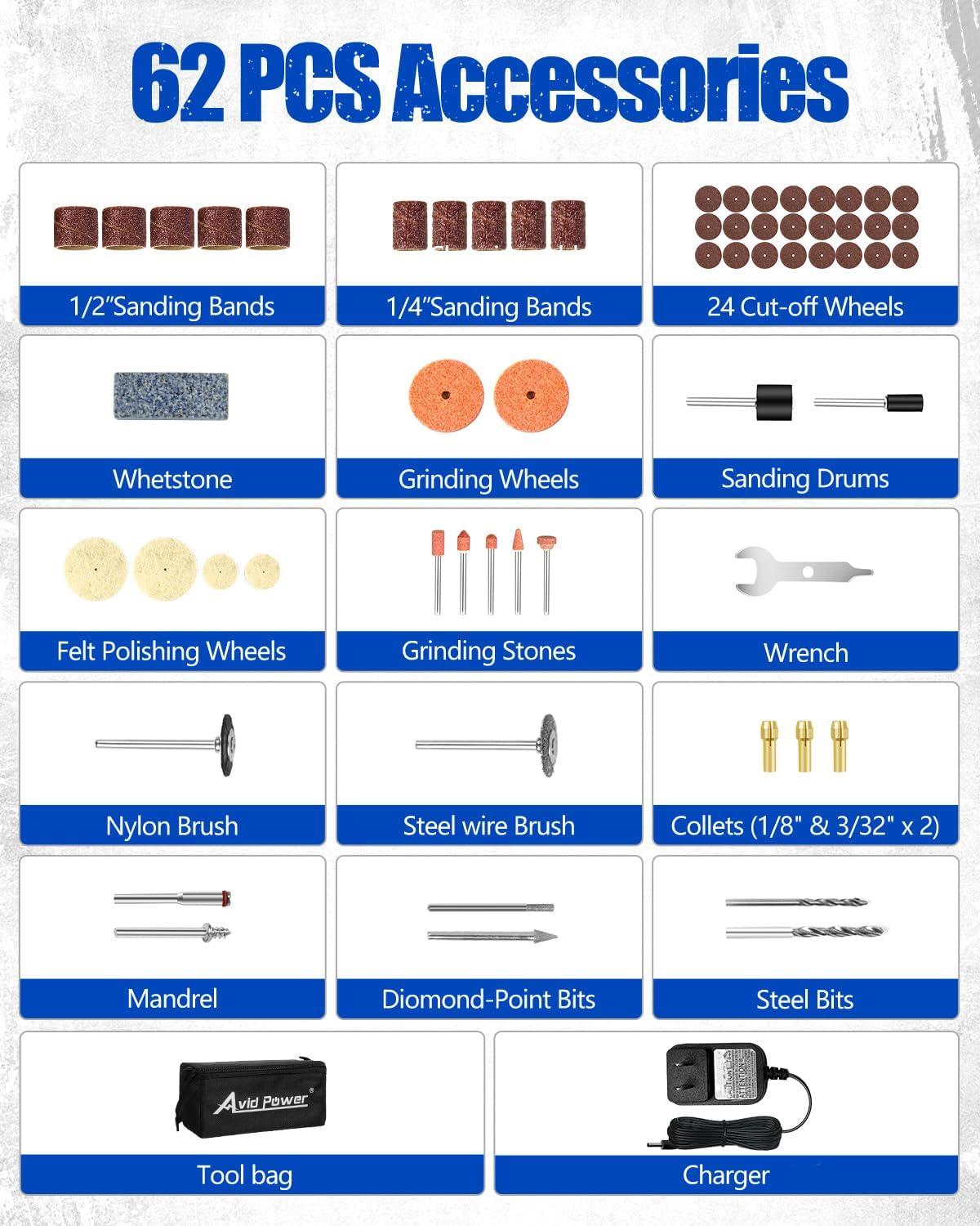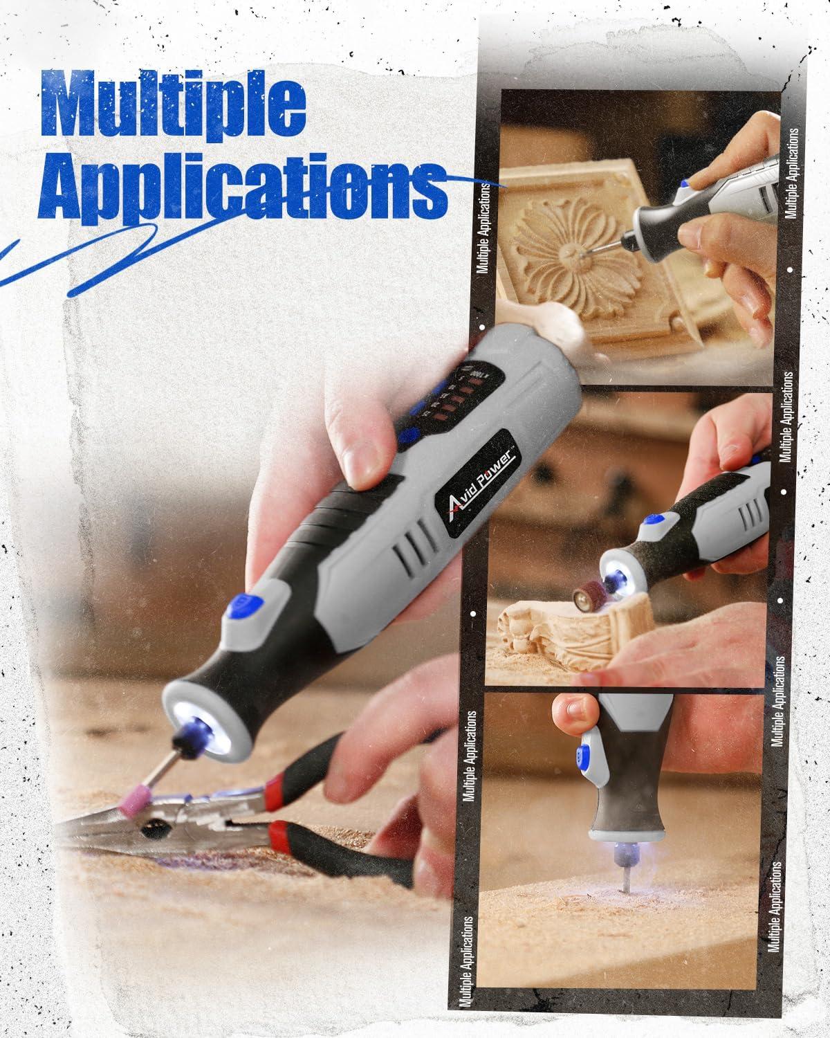 AVID POWER Cordless Rotary Tool 2.0 Ah 8V Rechargeable Rotary Tool, 4 Front LED Lights, 5 Speeds, 60 Pcs Rotary Accessories with Bag for Carving, Engraving, Sandng, Polishing and Cutting - Grey(Grey)