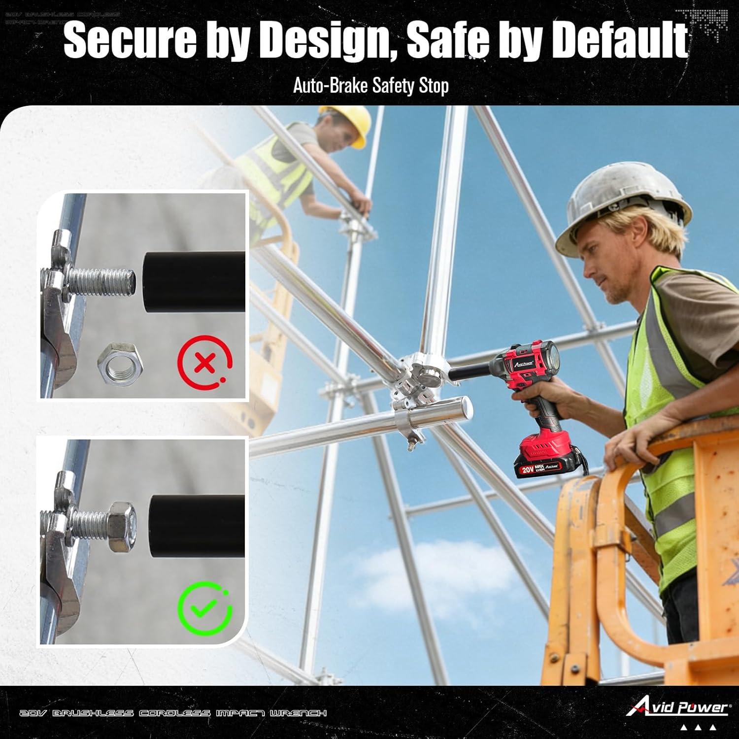 AUTO STOP SYSTEM: This impact gun is equipped with a Brake Stop function.The reversing self-stop function ensures that the nut will not fall off easily when you remove it. Simply press and hold the trigger when you turn on this function, and the square driver will turn a few turns and then stop automatically, which is more useful for high construction. Note: In reverse rotation (Loosen screw), speed is not adjustable