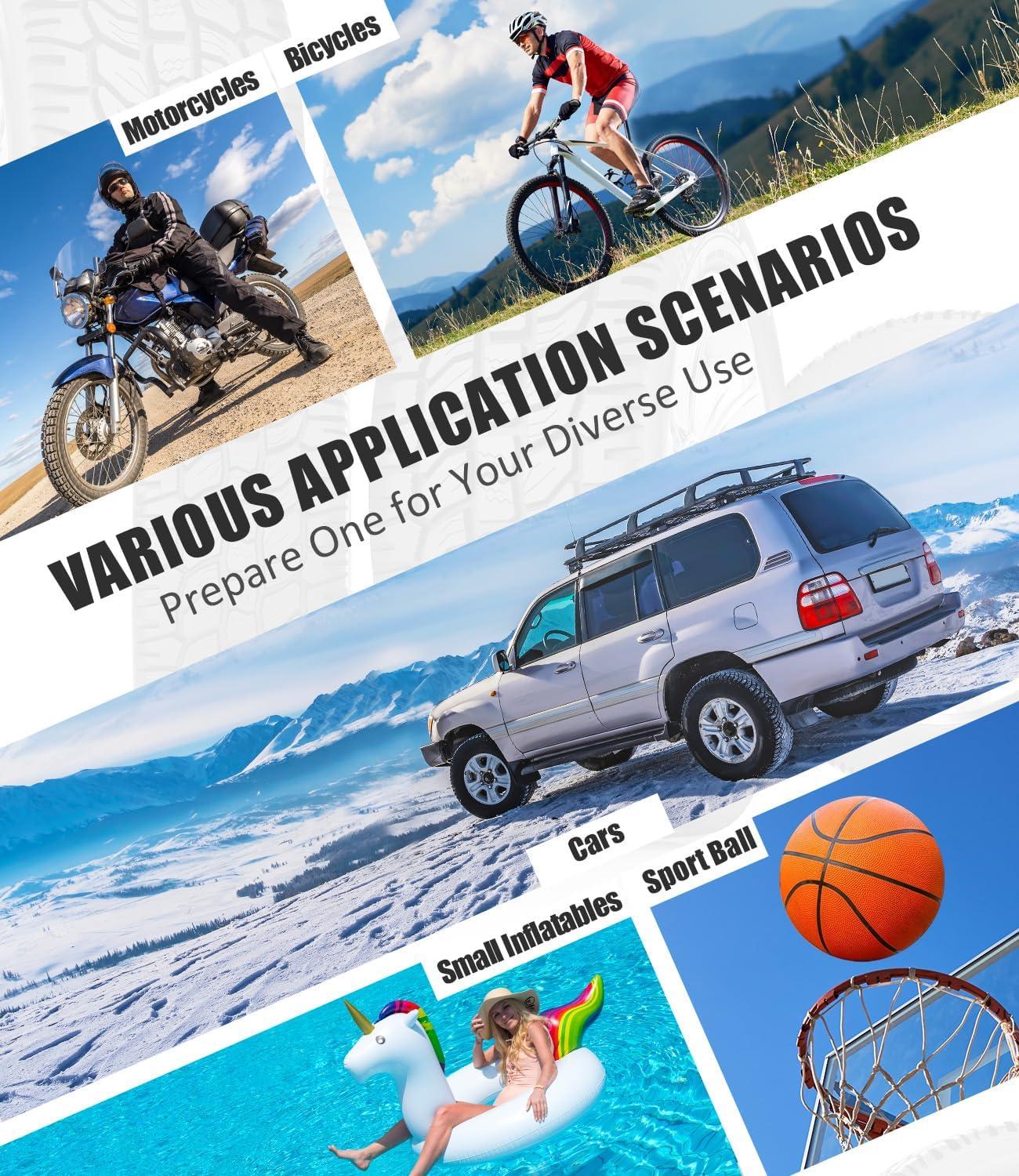 [Multipurpose Use] This portable tire inflator is ideal for cars (tires up to 245mm wide or 50 PSI), bikes, motorcycles, sports balls, and small pool toys. NOT suitable for commercial vehicles, trucks, large caravans, motor lorries, or high-volume inflatables