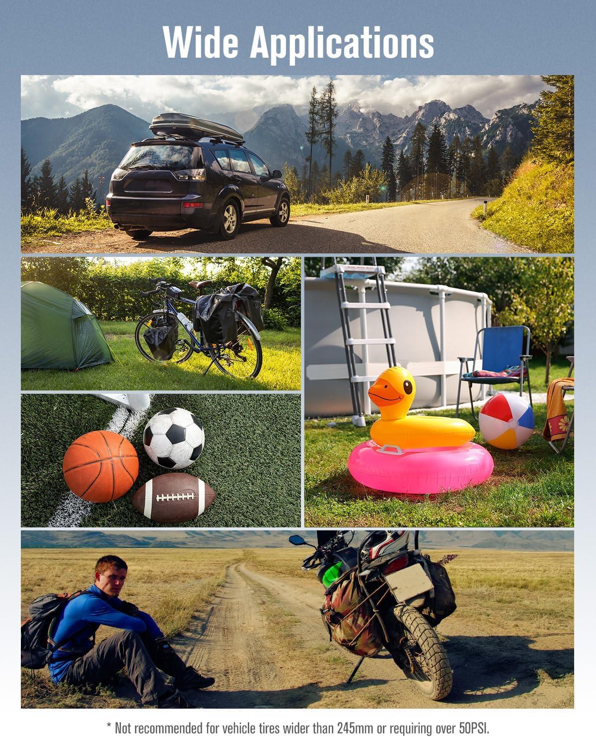 [Multipurpose] This handheld air compressor is compatible with cars, motorcycles, bicycles, sport balls and small inflatable pool toys. Note: It's not suitable for high-volume inflatables, paddleboards, rafts. And not recommended for vehicle tires wider than 245mm or requiring over 50PSI
