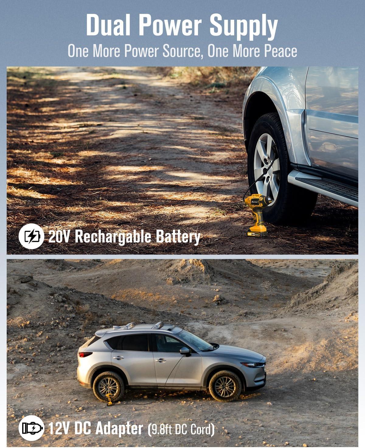 [Dual Power Supply for Maximum Flexibility] Powered by a 20V rechargeable Li-ion battery or a 12V DC adapter (with a 9.8ft cord), this portable tire inflator for car gives you options. Never stress about a dead battery on the road—just plug it into your car’s 12V outlet for uninterrupted use. Perfect for roadside emergencies