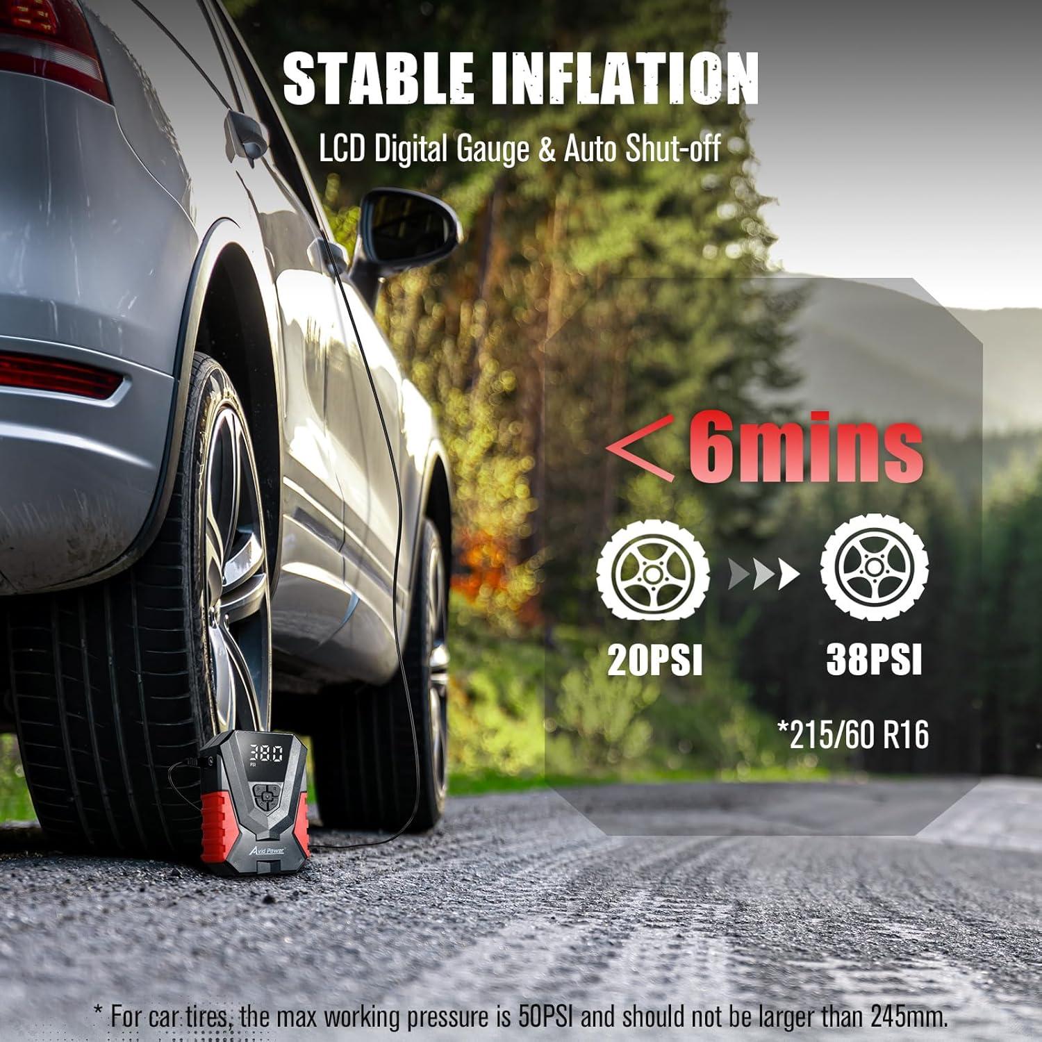 [Stable Inflation] Reliable electric air compressor delivers quick, hassle-free performance, inflating a 215/60 R16 tire from 20 PSI to 38 PSI in 6 minutes. The automatic shut-off function (+/- 2 PSI accuracy) prevents over-inflation, ensuring precise pressure every time. Ideal for emergencies, regular maintenance, or topping up tires at home or on the go
